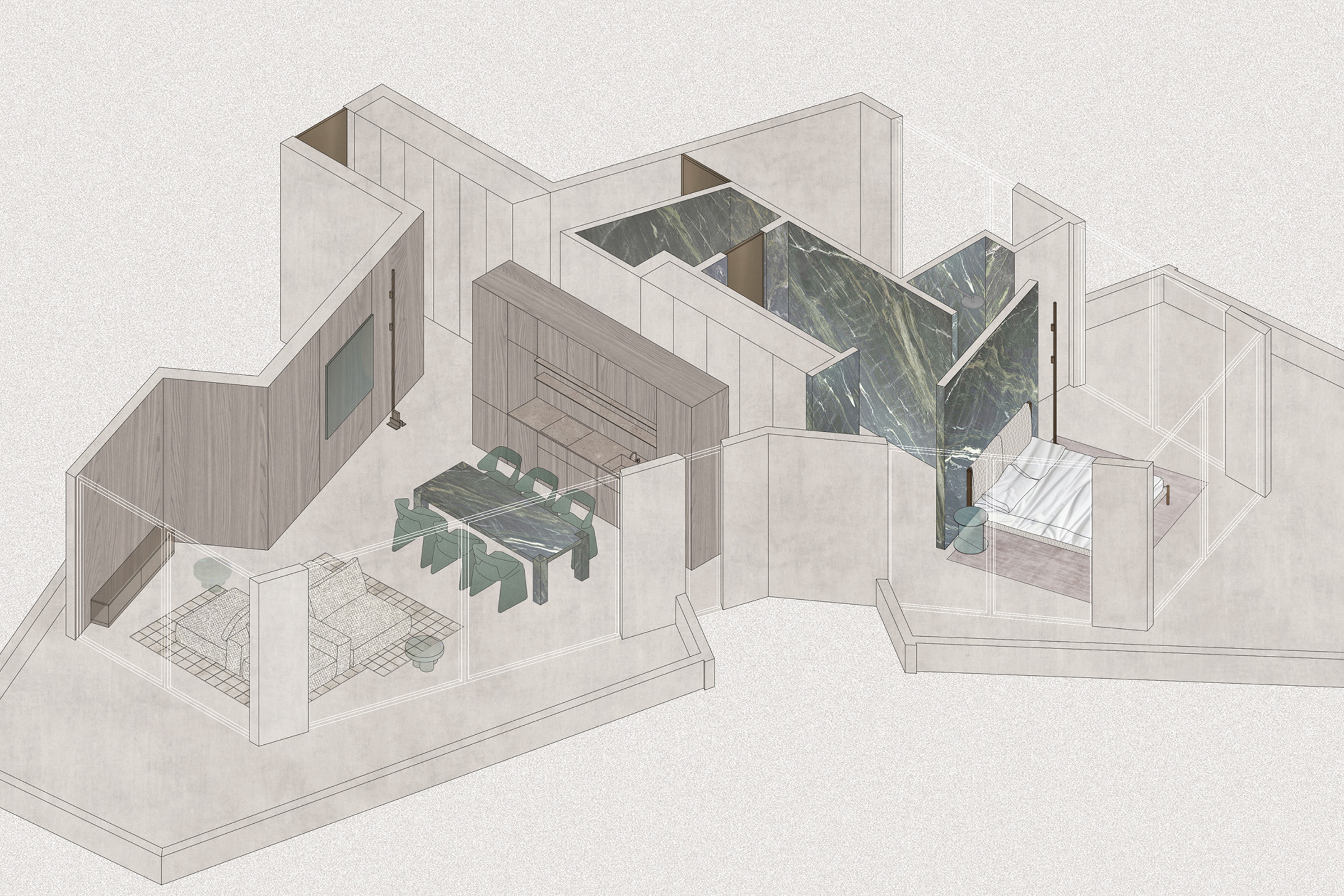 apartment set among mature pines. Designed as a holiday home, an irregular plan introduces a non-standard spatial scenario, where living areas extend into the master suite. Here, the bedroom and bathroom are combined into a single open setting, evoking a spa-like atmosphere. A single enclosed room provides a quiet space for work, supporting both retreat and everyday life. This sense of calm continues through the material palette – natural stone with a subtle seaweed pattern introduces movement, while bleached oak veneer recalls driftwood washed ashore.